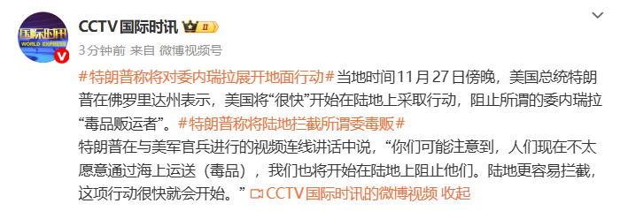 据@CCTV国际时讯东莞市股票配资公司,当地时间11月27日傍晚,美国总统特朗普在佛罗里达州表示,美国将“很快”开始在陆地上采取行动,阻止所谓的委内瑞拉“毒品贩运者”。